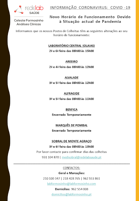 Adaptámos os nossos horários de funcionamento por forma a mantermos elevados padrões de qualidade, higiene e segurança, tanto dos utentes como dos profissionais de saúde e colaboradores do Laboratório.