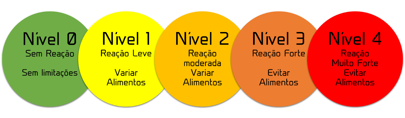 No resultado, cada alimento gera uma barra progressiva de diferentes cores de acordo com os níveis de resposta aos anticorpos: